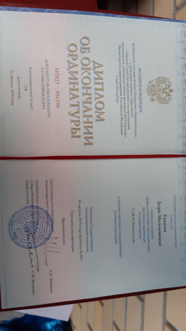 Ординатура: Медицинское училище при СПбГМУ им. акад. И.П. Павлова (ревматология).