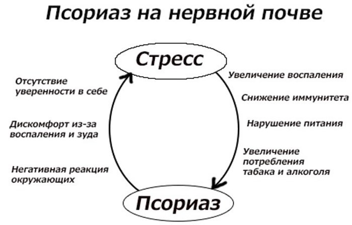 Серьезное психоэмоциональное перенапряжение, которое продолжается длительное время, специалисты связывают с появлениями первых симптомов псориаза. Степень нервного перевозбуждения напрямую будет влиять на степень заболевания и площадь распространения воспаления на коже. Чем чаще больной будет нервничать, тем тяжелее будет протекать заболевание.