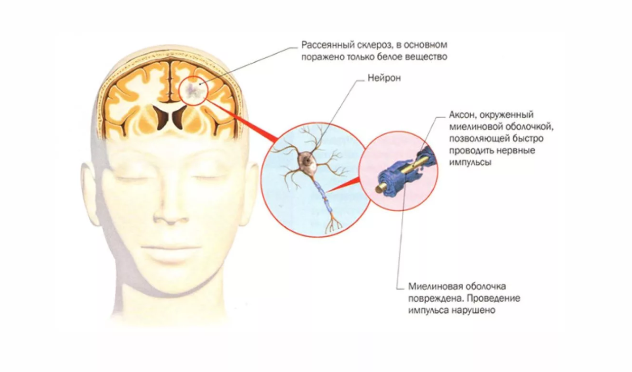Развивается болезнь, когда иммунитет распознает Т-лимфоциты в своих и чужеродных клетках. При попадании в головной мозг чужие клетки приводят к воспалению цитокинов, макрофагов – основных клеток иммунитета. Воспаление разрушает миелиновые ткани оболочки нейронов, что замедляет, а затем полностью прекращает передачу нервных импульсов. Этим определяются клинические проявления болезни.