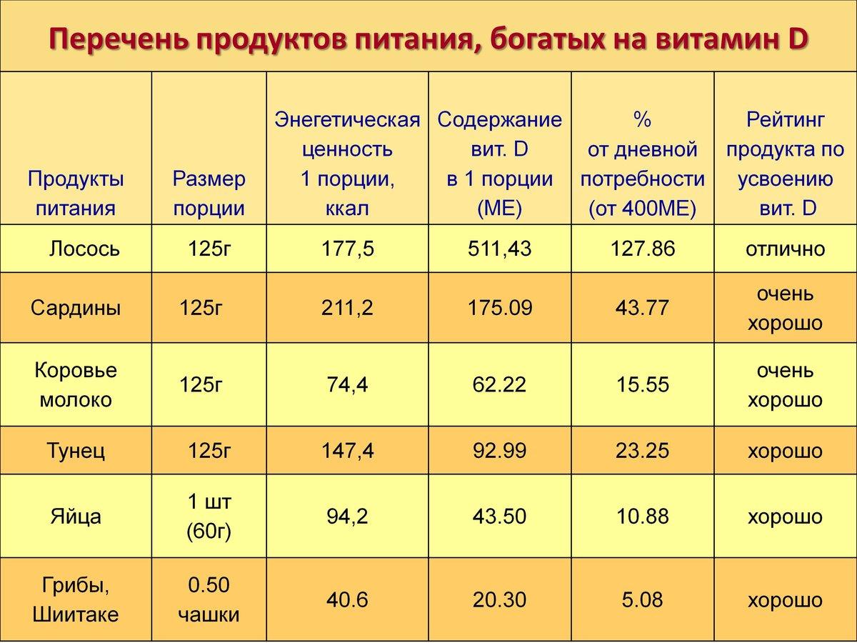 При составлении таблицы, учитывалось и то не поддающееся контролю количество витамина, которое продуцируется организмом под воздействием ультрафиолета.