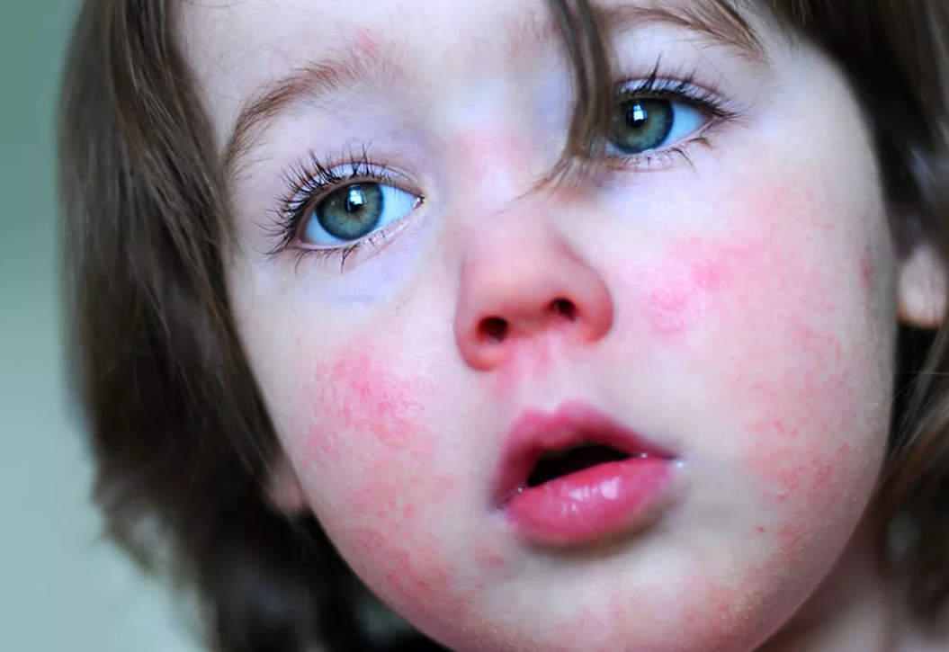• сыпь по всему телу, кроме носогубного треугольника, красная, мелкая (точечная);