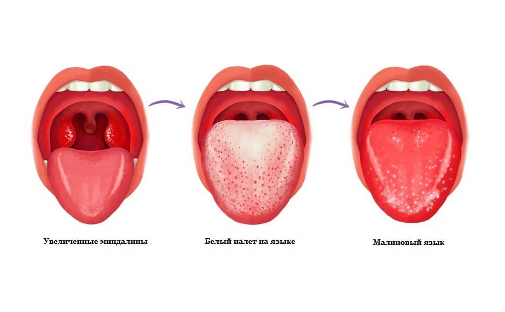 • язык малинового цвета, в первые 3-4 дня болезни с плотным белым налетом, который потом уходит, проявляются характерные пупырышки;