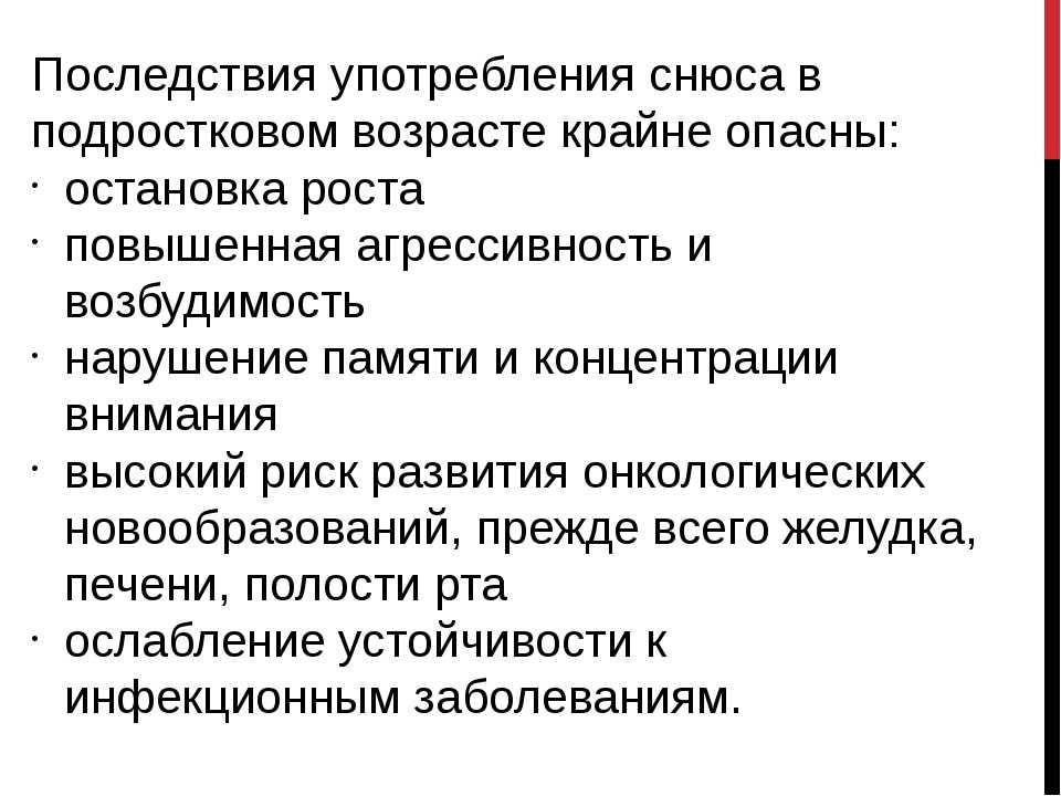 Многие подростки предпочитают употреблять снюс вместо сигарет, чтобы родители не почувствовали запах. Прием жевательного табака крайне опасен для неокрепшего молодого организма, так как он еще находится на стадии формирования.