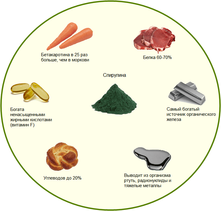 Основную долю в составе продукта занимает белок, незаменимый при занятиях спортом и активных физических нагрузках. Ценным элементом состава Спирулины является хлорофилл, который оказывает положительное влияние на иммунную систему человека.