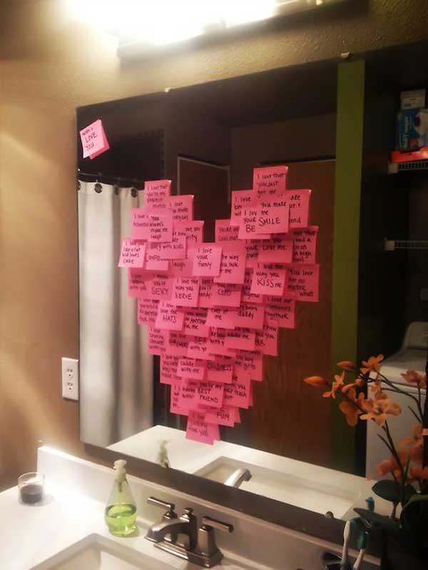 Подготовьте маленькие признания и напоминания о своих чувствах, написав их на небольших листочках. Разложите послания в карманы одежды своей второй половине или по дому, в тех местах, где они будут замечены.