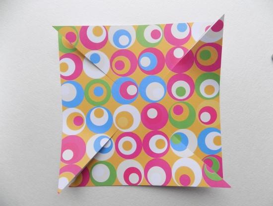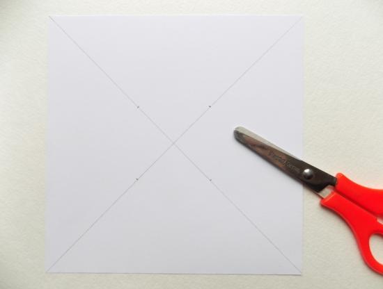 Теперь можно воспользоваться ножницами и разрезать строго по намеченным диагоналям, не доходя по 3 см до центра квадрата. После этого один край каждого из четырех получившихся элементов можно немного загнуть на себя.