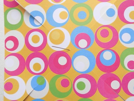 С помощью тонкой швейной булавки мы будем собирать нашу вертушку. Сначала наметим середину нашей поделки с лицевой стороны.